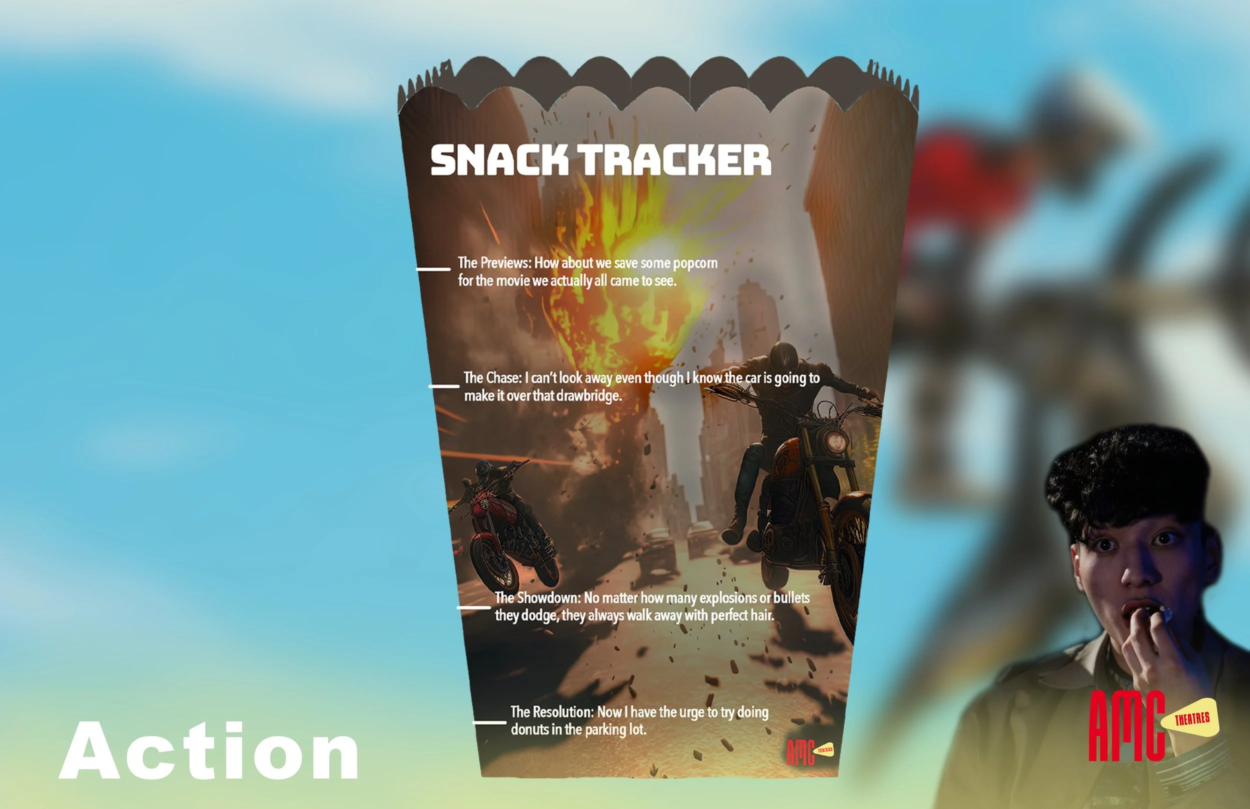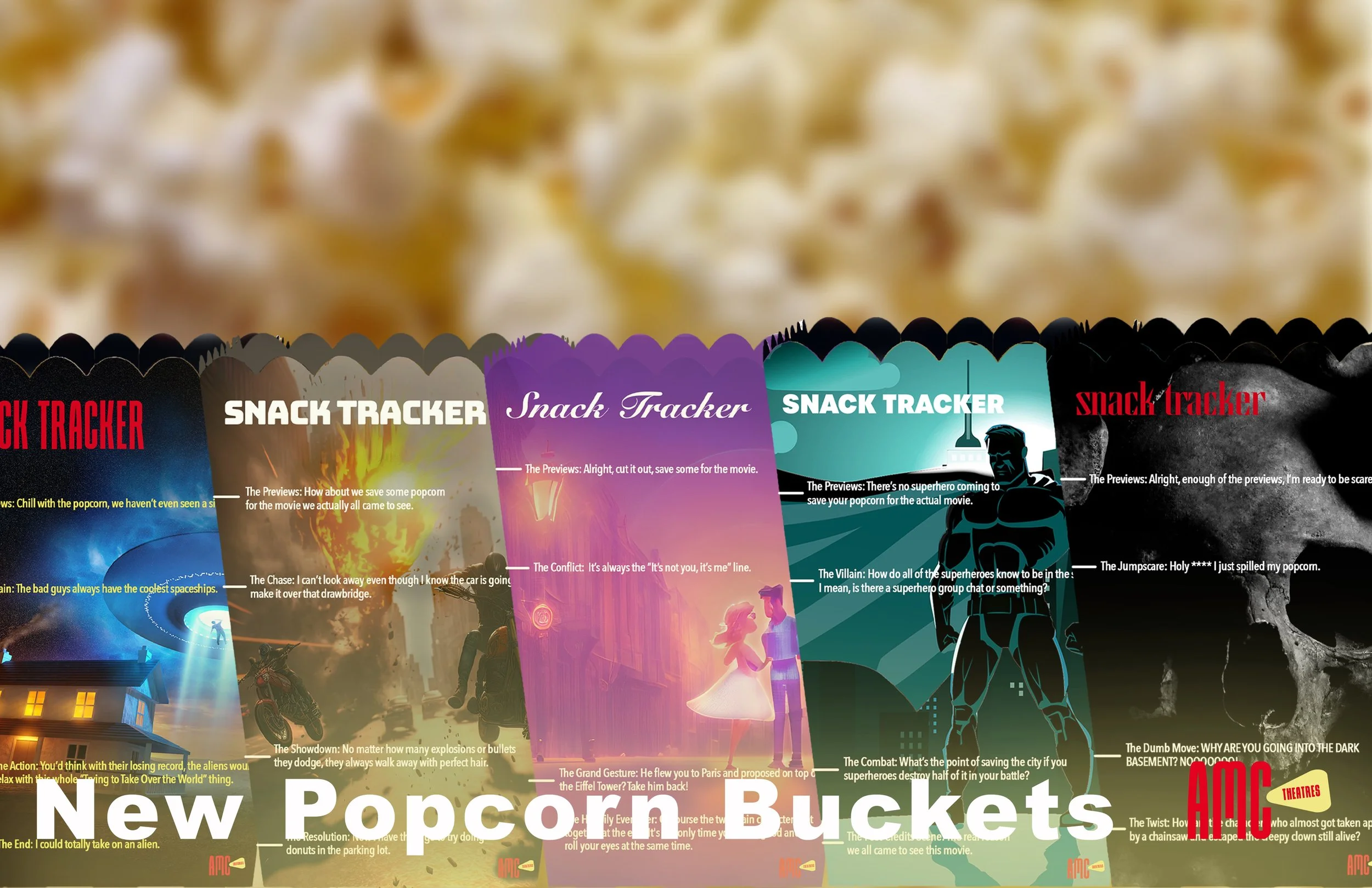 Solution: Create new, genre-themed popcorn buckets that measure time throughout the movie with various clichés as benchmarks.