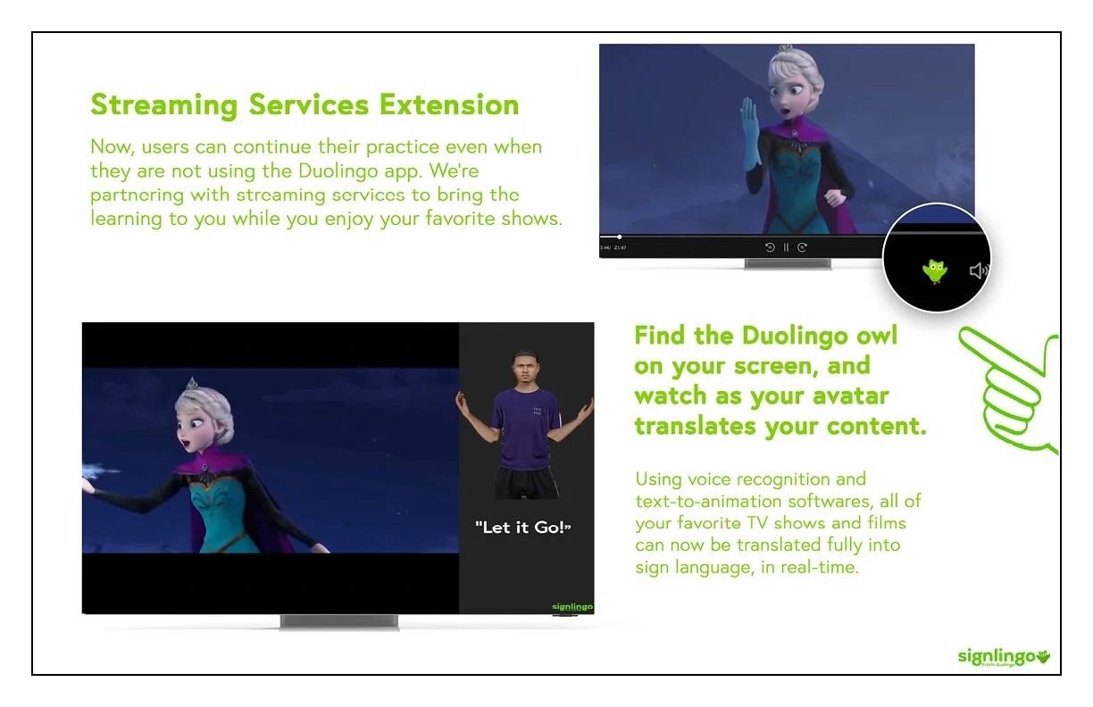 Execution: A sign language learning tool within the Duolingo app with additional digital assets.